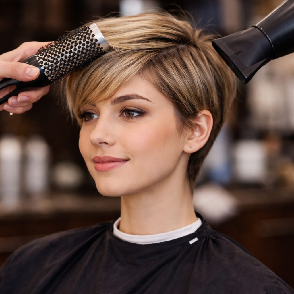 TĂžrking og tilfĂžring av lett volum eller retning til korte frisyrer.