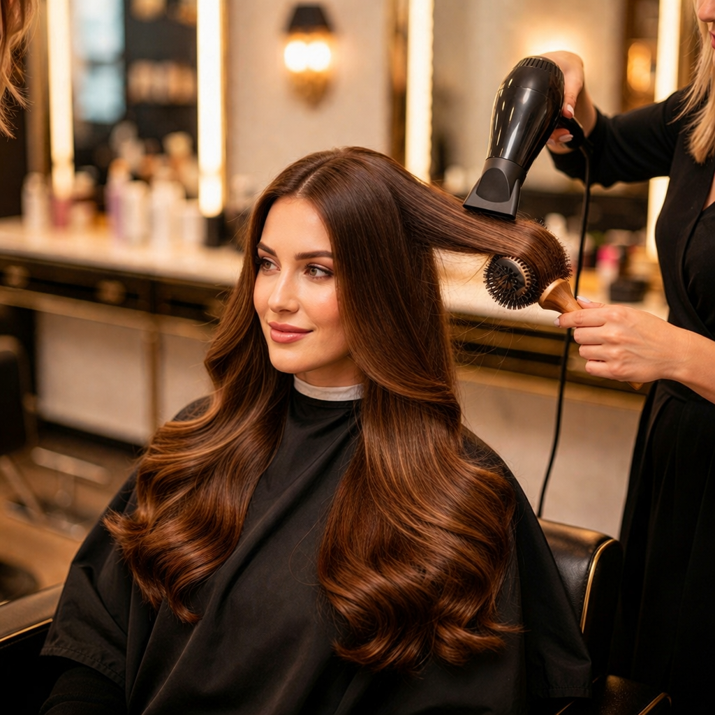 Grundig tÞrking og glatting av langt hÄr, ofte med rundbÞrste for fasong.